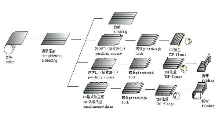 Work Flow: decoiler-staightening-beading-notching- punching –cutting-pittsburgh lock forming-coil conveyor-duplex TDF flange forming-duplex C cleat roll forming- hydraulic folding
